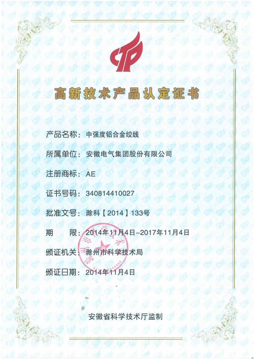 2014年(nián)11月4日,安徽電氣集團自(zì)主研發的(de)中強度鋁合金絞線,被安徽省滁州市(shì)科(kē)學(xué)技術局認定為(wèi)高(gāo)新技術産品,榮獲《高(gāo)新技術産品認定證書》。