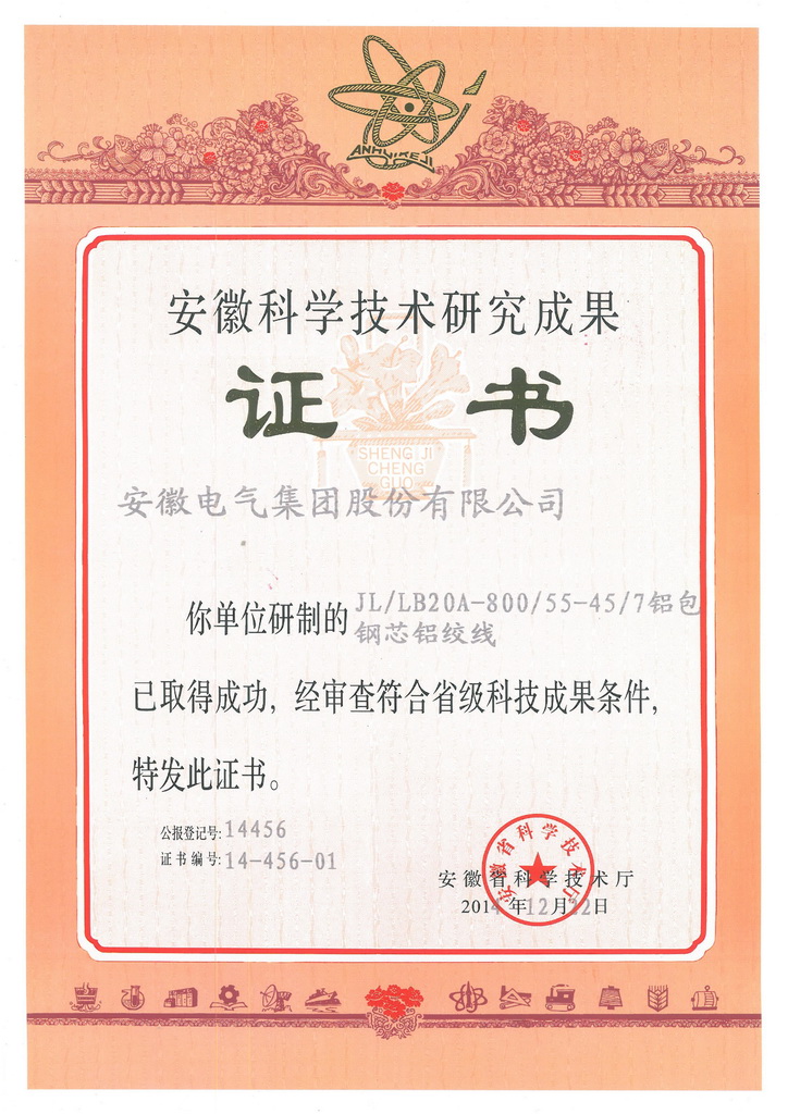 安徽電氣集團股份有(yǒu)限公司自(zì)主研制的(de)“JLHA3-675-61中強度鋁合金絞線”、“JL1/LHA1-745/335-42/37鋁合金芯鋁絞線”、“JL3/G1A-630/45-45/7鋼芯高(gāo)導電率鋁絞線”和(hé)“JL/LB20A-800/55-45/7鋁包鋼芯鋁絞線”等四類産品獲得安徽省科(kē)學(xué)技術廳正式頒發的(de)科(kē)學(xué)技術研究成果證書,相關研制人員也分别獲得了個人成果證書。